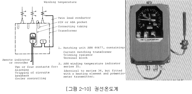 Oil최고온도를 지시하는 유 온도계와 권선의 최고온도를 지시하는 권선온도계가 있으며, 권선온도계는 고객의 요구에 따라 대형변압기에 취부한다.