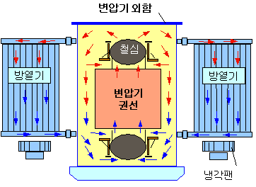 냉각팬은 방열기의 하부 또는 측면에 부착되며, 팬의 동작을 위한 On/Off 스위치나 보호장치 등이 제어반에 장치되어 변압기측면에 취부된다.