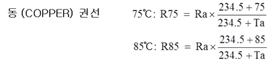 동(COPPER)권선 저항치를 표준온도로 바꾸기 위한 식은 다음과 같다.