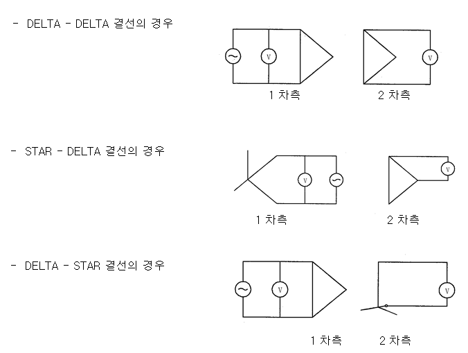 스타 결선 변압기는 각 선로의 부싱과 중성점 부싱 사이에서 측정하고, 각 상의 값을 합하여야 됩니다. 델타 결선 권선은 각 부싱 사이를 측정하여 합한 값에 ⅔를 곱하면 됩니다. 어느 쪽의 경우라도 3개의 분리된 기록들은 차후 변압기 점검시 비교치로 사용할 수 있도록 보관되어야 합니다.